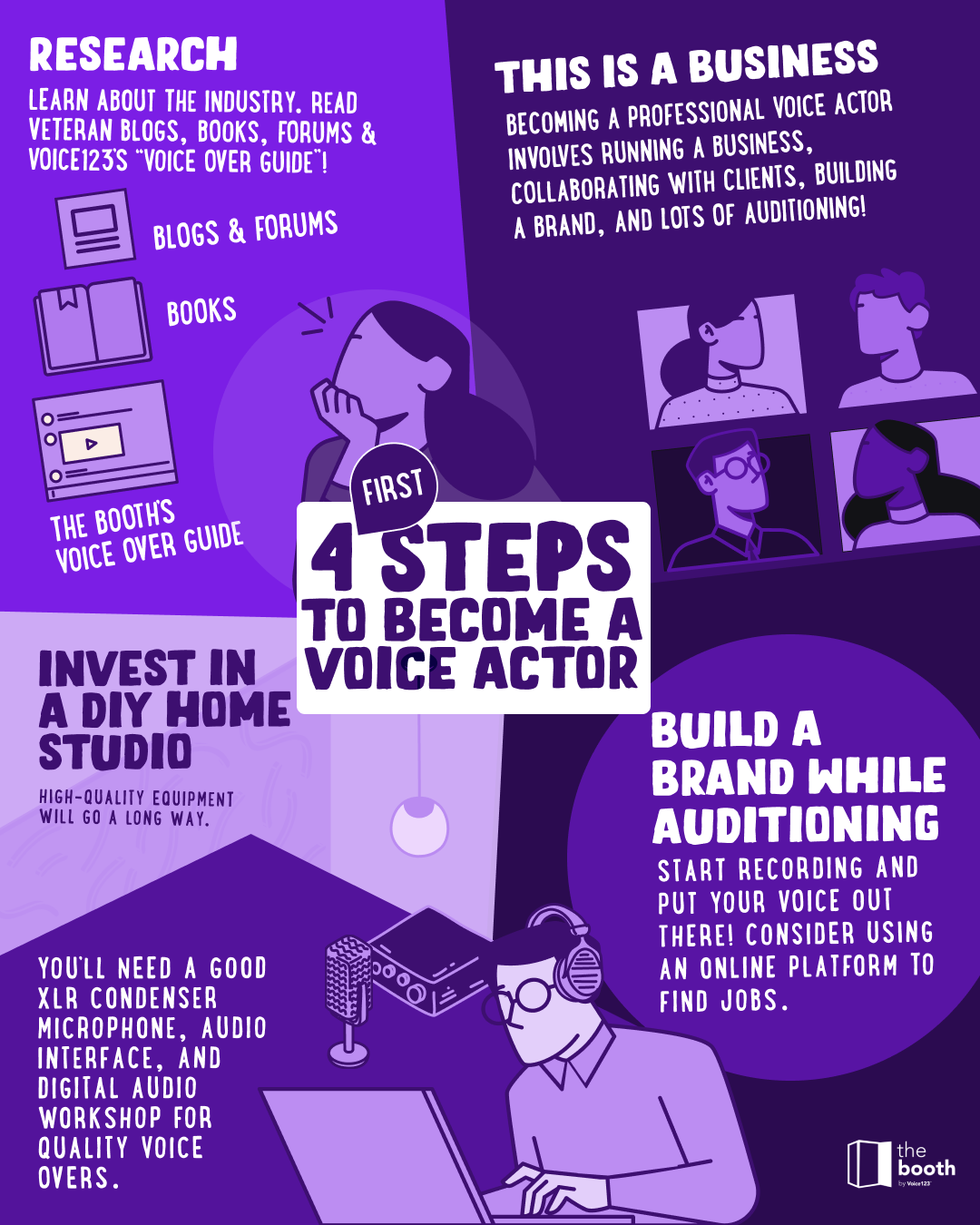 Since Voice123’s inception in 2002, we’ve been helping clients and voice actors to create meaningful connections. Now, we’ve added The Booth – a content studio for voice actors and freelancers, hosting our updated voice over guide.